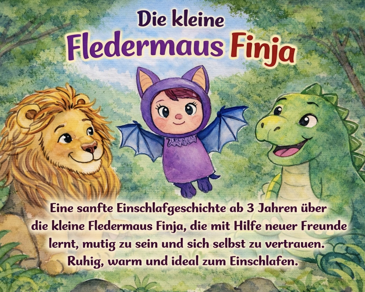 Eine sanfte Einschlafgeschichte ab 3 Jahren über die kleine Fledermaus Finja, die mit Hilfe neuer Freunde lernt, mutig zu sein und sich selbst zu vertrauen. Ruhig, warm und ideal zum Einschlafen.